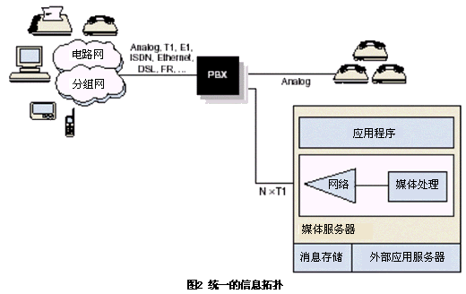 圖2是有前提的典型統(tǒng)一消息拓?fù)鋱D。這個(gè)例子中媒體服務(wù)器管理消息的存儲(chǔ)和提取,這些消息包括語(yǔ)音、傳真、數(shù)據(jù)或視頻。它可以訪問(wèn)不同媒體文件以及必要的控制規(guī)則以實(shí)現(xiàn)各類媒體業(yè)務(wù)。可以在本地的媒體服務(wù)器上也可以在遠(yuǎn)程的集中存儲(chǔ)系統(tǒng)上進(jìn)行存儲(chǔ)。在這種情況下,能提供語(yǔ)音和傳真資源的統(tǒng)一的消息系統(tǒng)通常和email系統(tǒng)比如微軟的Microsoft