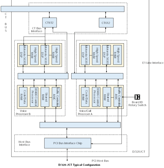 D/320-JCT板卡通過與外部網(wǎng)絡(luò)連接的CT總線接口與網(wǎng)絡(luò)接口板卡相連。DSP資源通過一個CT612模塊接收數(shù)字語音數(shù)據(jù),CT612作為到CT總線的接口。DSP基于下載到它的高速RAM中的Spring