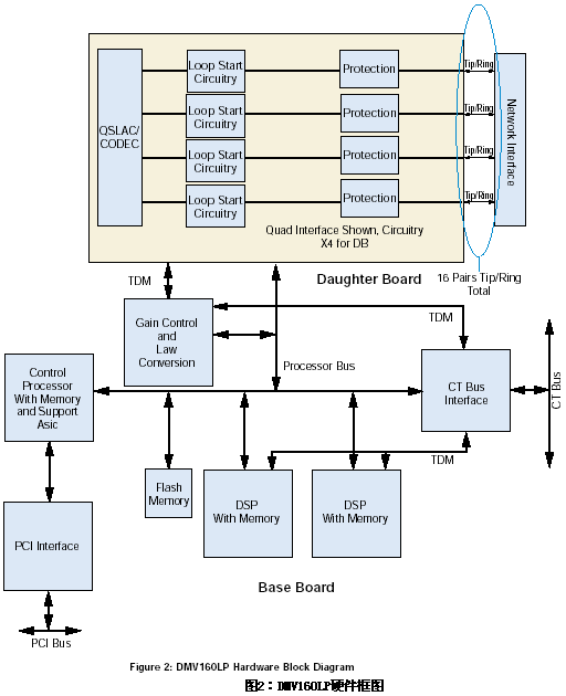 當(dāng)板卡上的呼叫處理資源被利用的時候,網(wǎng)絡(luò)信號就被提取出來并且被送到板卡上的控制處理器中,該處理器可以改變信道狀態(tài)而且可以通過共享的RAM和主機(jī)的PCI總線將信道事件傳送給應(yīng)用程序接口。
