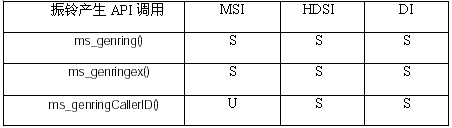 為主叫ID提供頻移鍵控(FSK)能力,HDSI和DI座席支持ms_genringCallerID() API調(diào)用,也支持基礎(chǔ)的和擴展的MSI振鈴產(chǎn)生函數(shù)調(diào)用。表2列出了每一座席產(chǎn)品支持的產(chǎn)生振鈴的API函數(shù),支持的API調(diào)用以"S"表示,不支持的調(diào)用用"U"表示。
