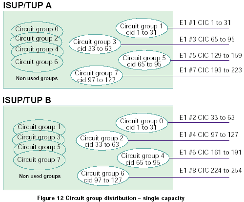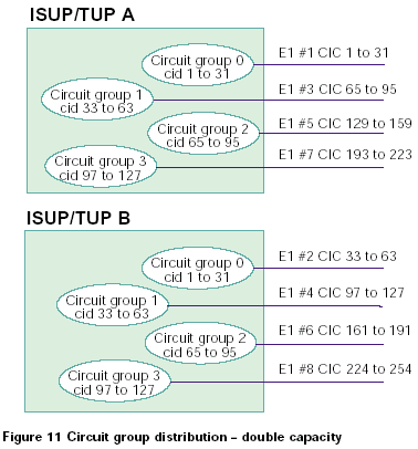 兩個系統(tǒng)中的電路組既可以從0開始編號,也可以兩個系統(tǒng)間隔標號。如果使用第一種方法,整個系統(tǒng)的容量就是單ISUP/TUP協(xié)議層系統(tǒng)的容量的2倍,如果使用第二種方法,系統(tǒng)總容量與單ISUP/TUP協(xié)議層系統(tǒng)的容量相同。對于這兩種情況,每半部分控制對立的CIC范圍,如圖11和12所示: