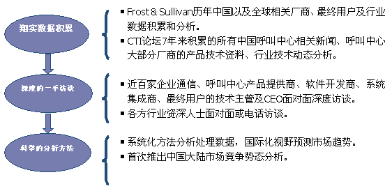 Frost & Sullivan 和 CTI論壇(www.zhaolingmuyuan.com)共同組成的調(diào)研小組,在查閱了大量資料的基礎(chǔ)之上,以企業(yè)通信及呼叫中心的設(shè)備應(yīng)用、投資計(jì)劃以及相關(guān)廠商的市場表現(xiàn)為出發(fā)點(diǎn),通過對企業(yè)通信及呼叫中心重要應(yīng)用企業(yè)、在市場占主導(dǎo)地位的二十多家設(shè)備廠商、二十多家軟件開發(fā)商、十幾家系統(tǒng)集成商、數(shù)家外包運(yùn)營商的深度訪談,參閱內(nèi)部相關(guān)報(bào)告及數(shù)據(jù)庫,對數(shù)據(jù)的來源和數(shù)據(jù)的準(zhǔn)確性進(jìn)行了詳細(xì)核對與論證;憑借參與調(diào)研人員的多年從業(yè)經(jīng)